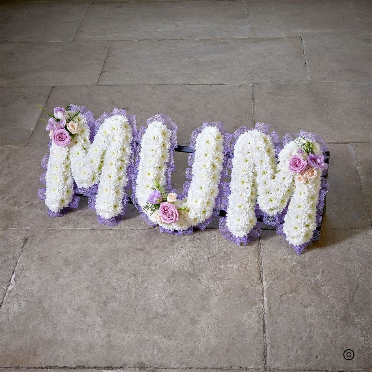 Elegant white double chrysanthamum flowers covering each letter/number with a colour coordinating pleated ribbon or folidge around the edge of each letter/number. A beautiful floral arrangement with choice of coloured flowers. these are then placed securely on a nice sturdy stand so that they are displayed in a way to enhance their beauty.